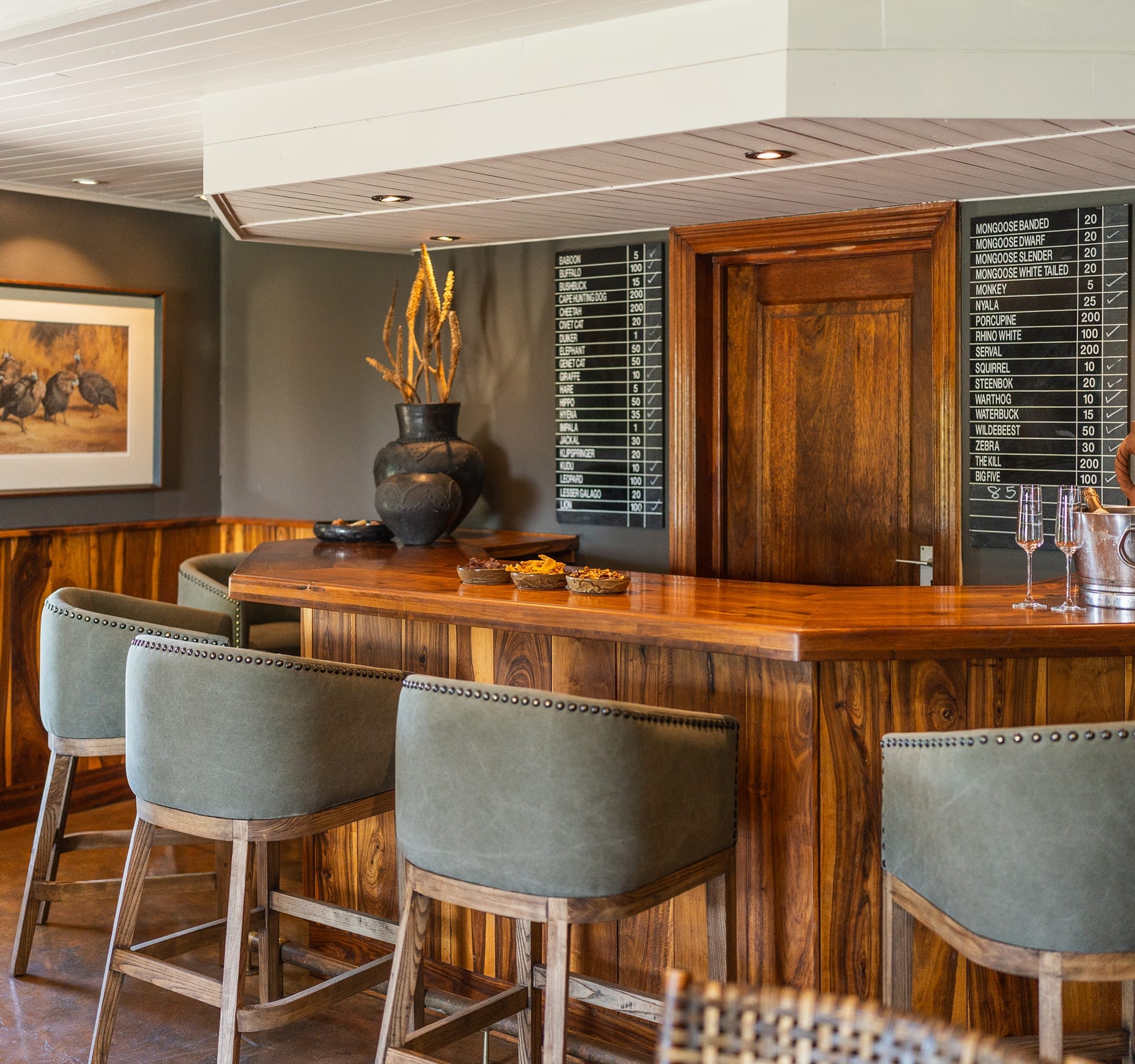 Informally elegant, both the library and cozy lounge are ideal for complete relaxation and all main indoor areas are air-conditioned. The intimate space features satellite TV and a bar, providing a comfortable, quiet spot where guests can review their daily photos and withdraw to relax and cool down after game drives. A professional massage service and gym facility are available at nearby MalaMala Camp.