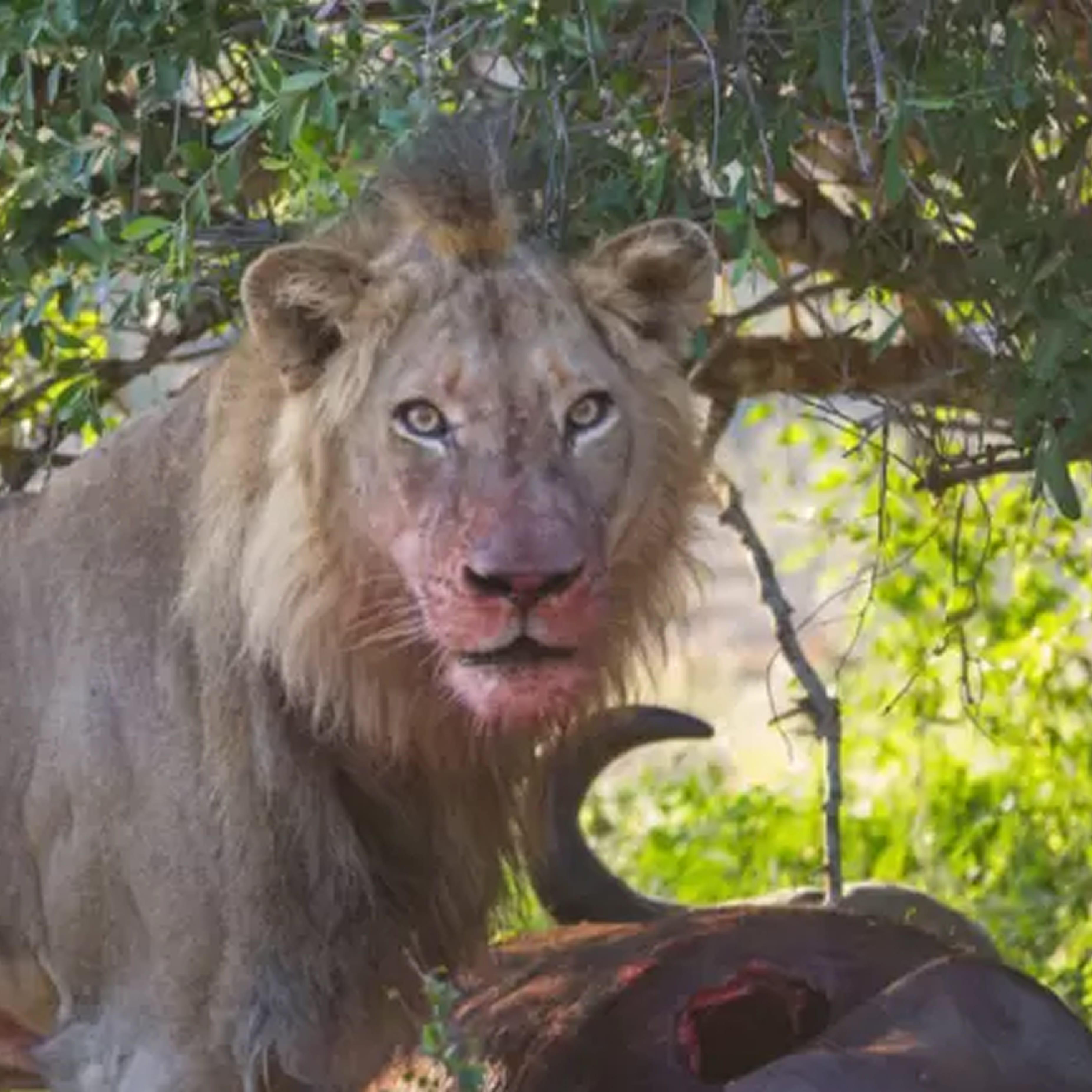 The young male lion had started to feed off the distressed old buffalo bull (the previous day we had noticed what looked like a very sick buffalo in the area and we assumed this was the same animal). The two hyenas had arrived on the scene and were whooping incessantly. The male leopard was still 20 meters away looking on through thick bush from an elevated vantage point. To add to the drama we could hear other lions roaring from the east and west. The hyena calls were being answered and soon a sighting with two hyenas became a sighting with over 20. Their noise alone was exhilarating.