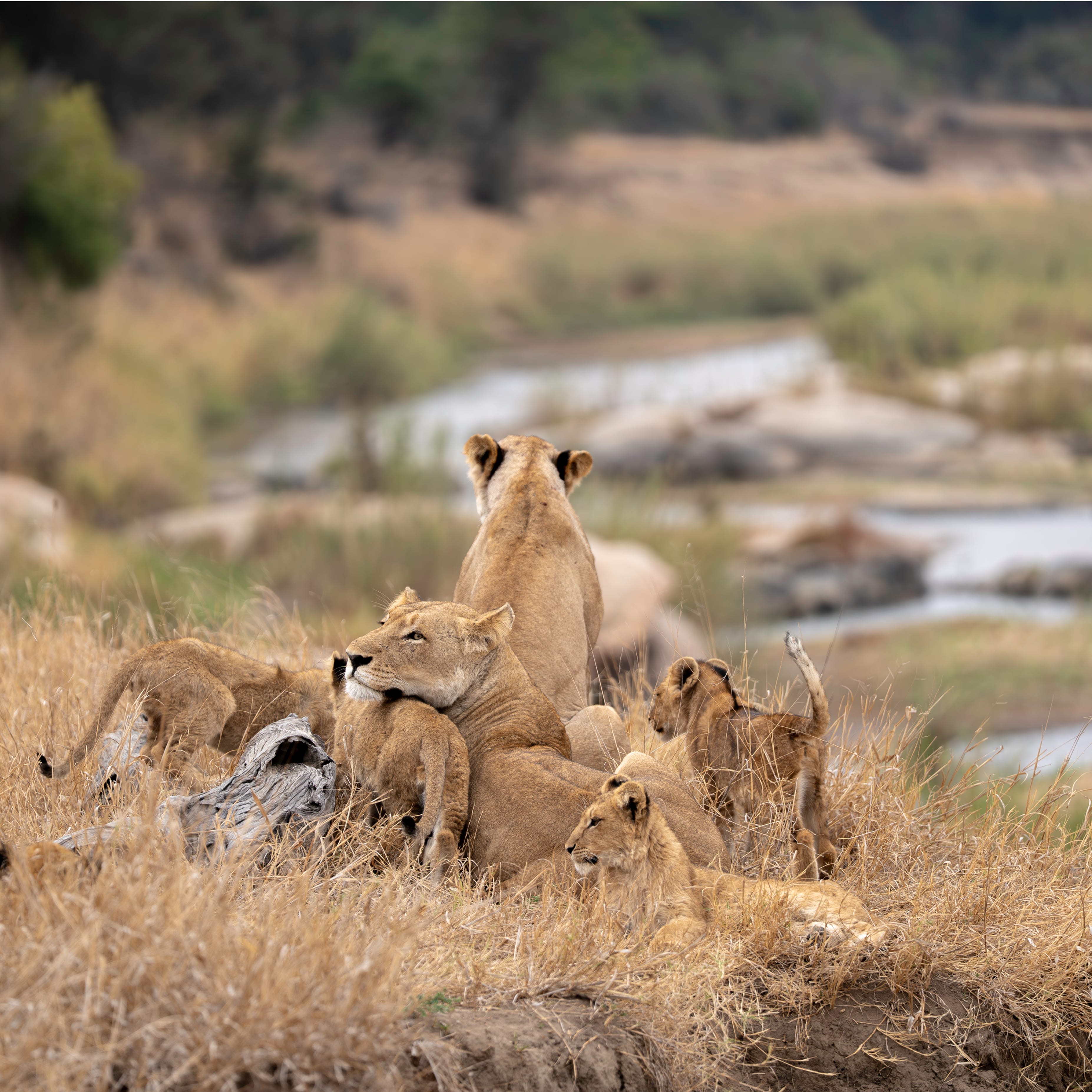 The buildup: It was summer. The 6 lionesses and a single male lion from the Gowrie coalition descended the eastern bank of the Sand River, then the females crossed west to where they’d left their cubs on the western bank. We had watched with delight as they edged their way through the flowing watercourse. There was a bit of commotion when they exited onto the opposing bank as the channel was deeper than they had expected. As they ascended up the steep bank, we could hear their low resonant contact calls and it was not long before all 12 cubs came scampering down the bank to greet them with multiple head bumps and nuzzles. While this overload of affection was tugging on heartstrings and filling up memory cards, a more sinister creature was floating down stream. A 6-foot crocodile had become aware of the crossing animals thanks to the sensory nodules and depressions in the skin on its head that allows it to detect even faint movements in the water. Slowly it approached the crossing point that the lionesses had used and sank ominously below the surface. While a fully-grown lioness would be a bit too large for a crocodile of this size to take on, a struggling lion cub in the rivers current would be an easy catch. We watched with bated breath as the lionesses began to lead their cubs back to the water’s edge.