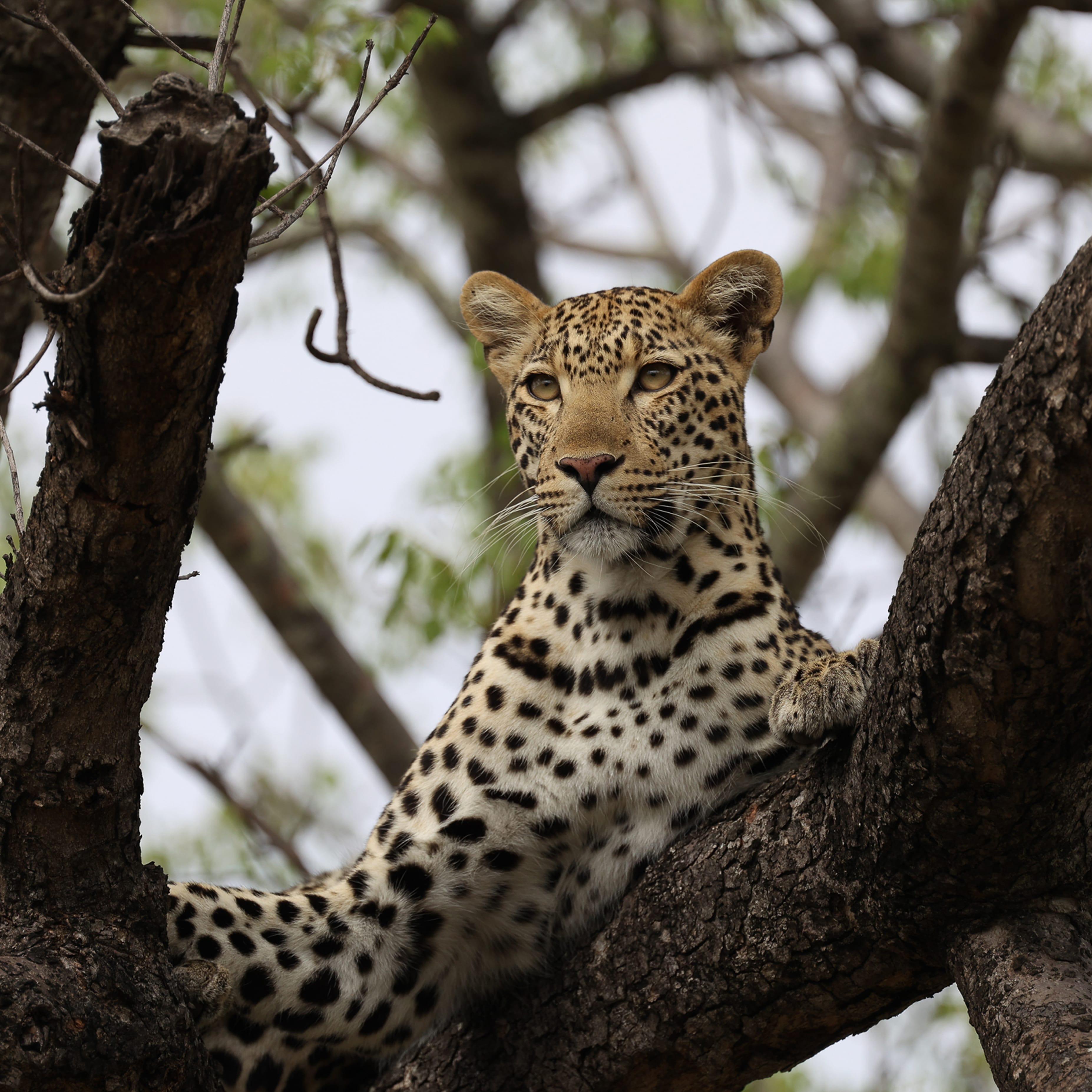 With the Manyeleti River flowing again for the first time in two years, a pool of water had accumulated around a large set of granite rocks. At that point, the southern bank of the river is adorned with large trees within lush thickets while the northern bank is a steep and rocky cliff face on top of which grows a stand of euphorbias. It’s the type of setting fit for Africa’s most beautiful cat and it was the scene of an incredible sighting on Friday.